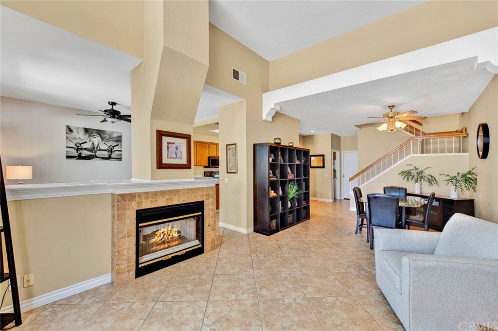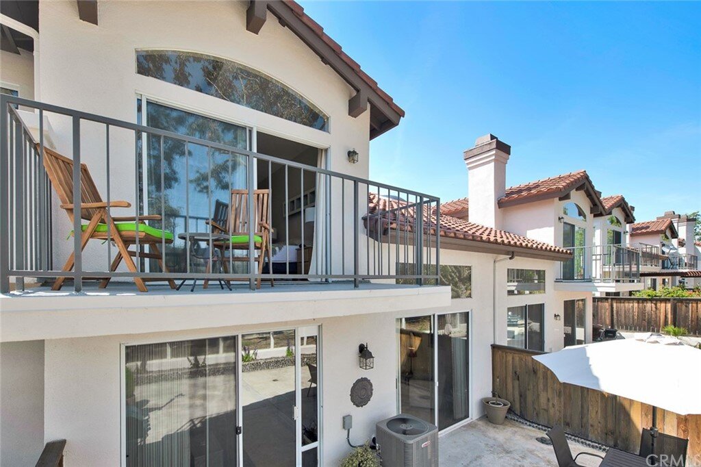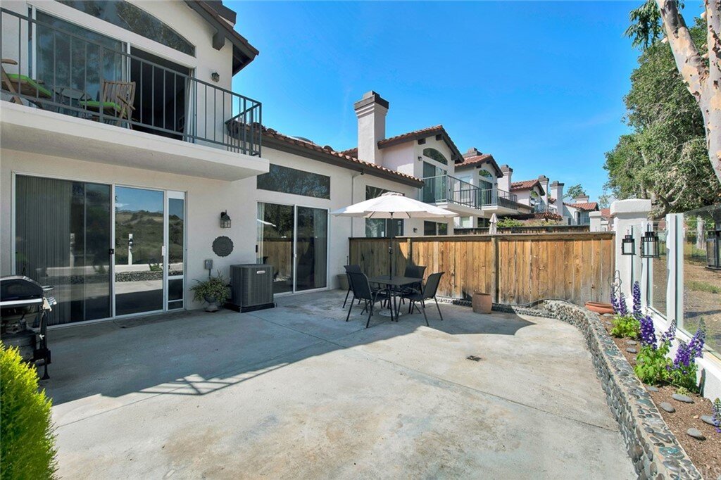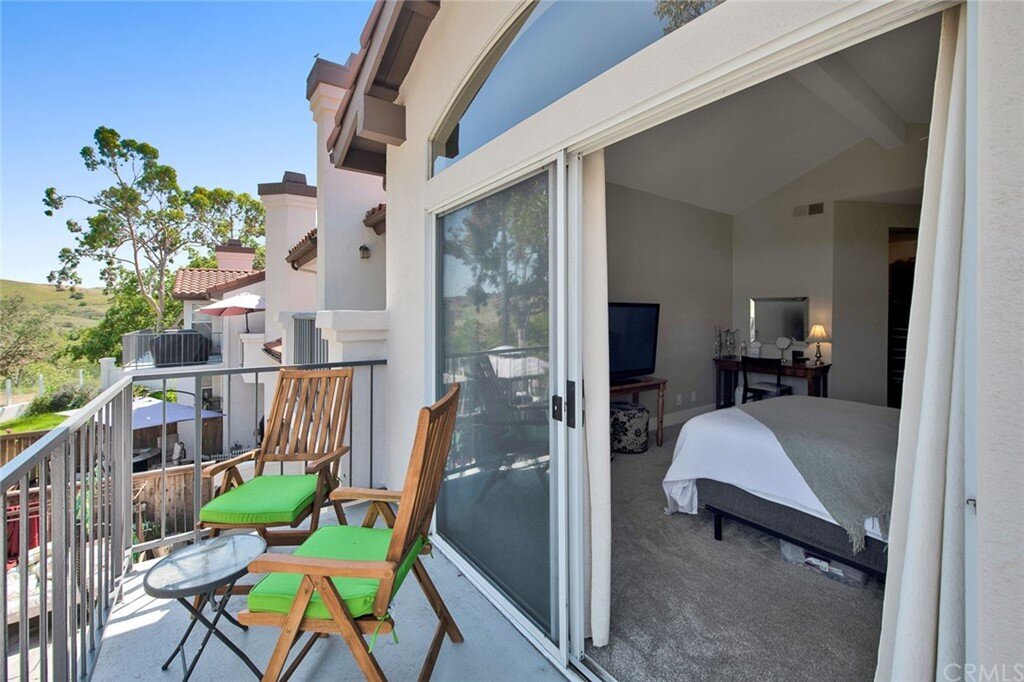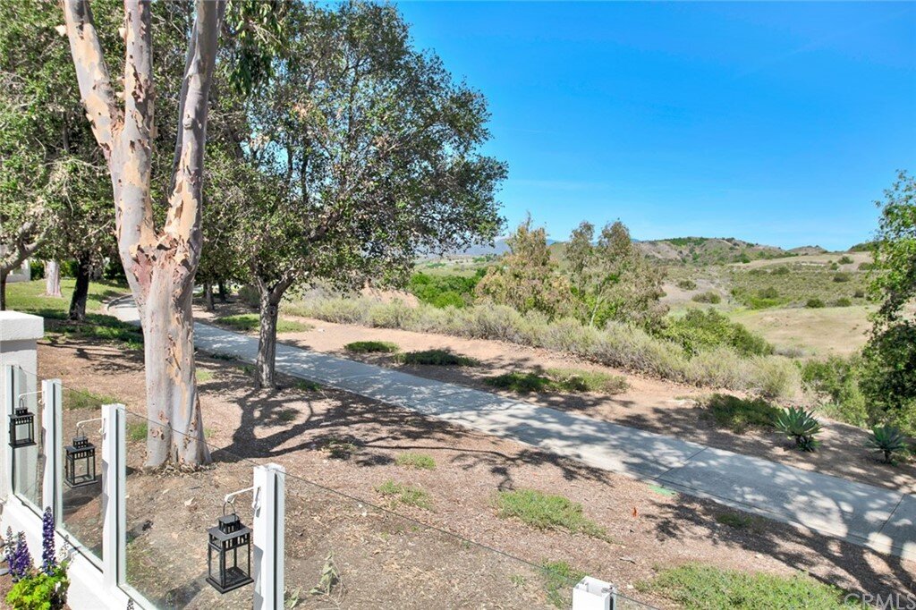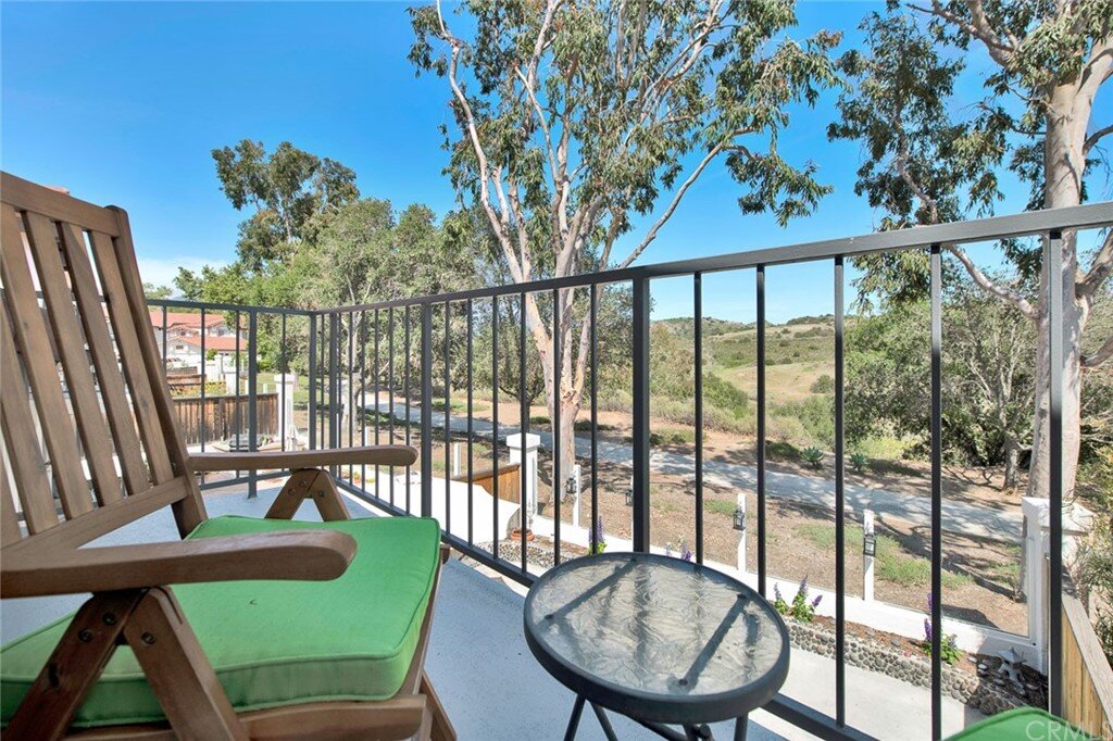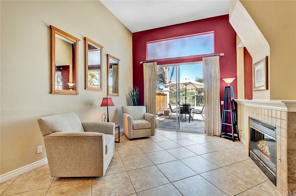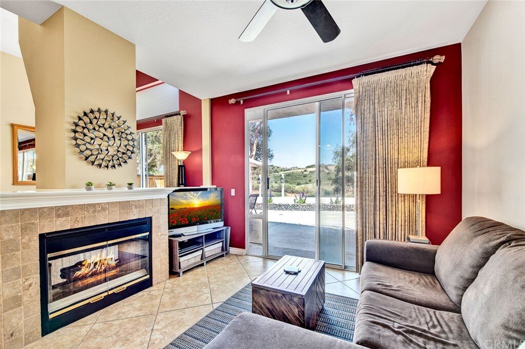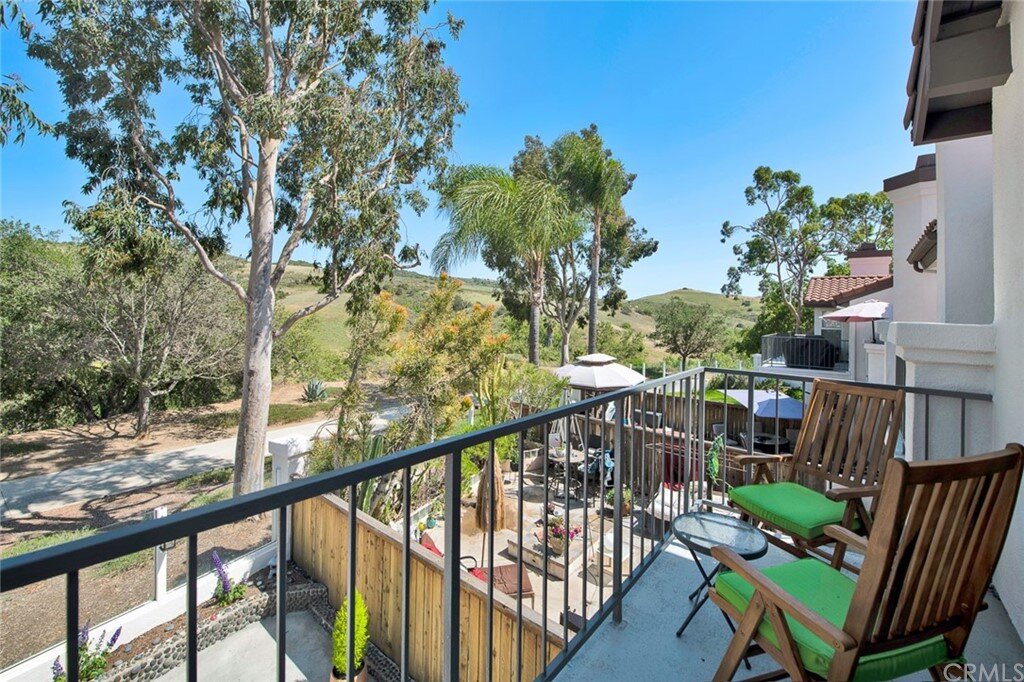 Welcome to the most extensive floor plan in the highly sought-after Candelero Community with incredible views! Upon entering this home, you are met with beautifully maintained large neutral porcelain tile floors expanding throughout the downstairs; the walls are neutral with one accent wall. The vaulted ceilings in the living room make for an open and airy space to relax as you enjoy the view of the hillside and canyon below. A custom tiled dual-sided fireplace can be enjoyed in living and family rooms. Dual sliding glass doors afford a fantastic view from either side of the home. The kitchen provides ample cupboard space, white tile countertops, black stainless steel appliances, and a bar-height counter where you can pull up a stool to enjoy a quick meal. The downstairs half bath shows with white cabinetry and olive-toned paint. The enormous enclosed patio is perfect for entertaining. Enjoy shady evenings BBQing with friends and family. Look out to the panoramic canyon view. Easy to care for concrete with newer side fencing. New in 2022 A/C compressor and coil. 2 car attached garage with laundry and 48 sq. ft. overhead storage. Walk upstairs on the new plush neutral carpet with upgraded padding for extra cushion and pet protection. The large master bedroom amazes with vaulted ceilings, a walk-in closet, and an oversized sliding glass door. Off the master is a quaint balcony overlooking the hillside and canyon. The master bath is newly remodeled and breathtaking, with grey porcelain tile continuing from the floor up the shower wall to the ceiling. An oversized glass frameless shower door provides a beautiful infinity look. With white cabinets, gray quartz counters, and metal hardware. 2 additional spacious bedrooms, a landing, and a newly renovated second bathroom, complete the upstairs space. The plumbing in this home has been rerouted from underneath the slab, so there is no possibility of a slab leak. Also included is a new water heater. Low taxes, no Mello Roos, steps away from 4 miles of wilderness trails, parks, tennis courts, and Tijeras Creek Golf course.